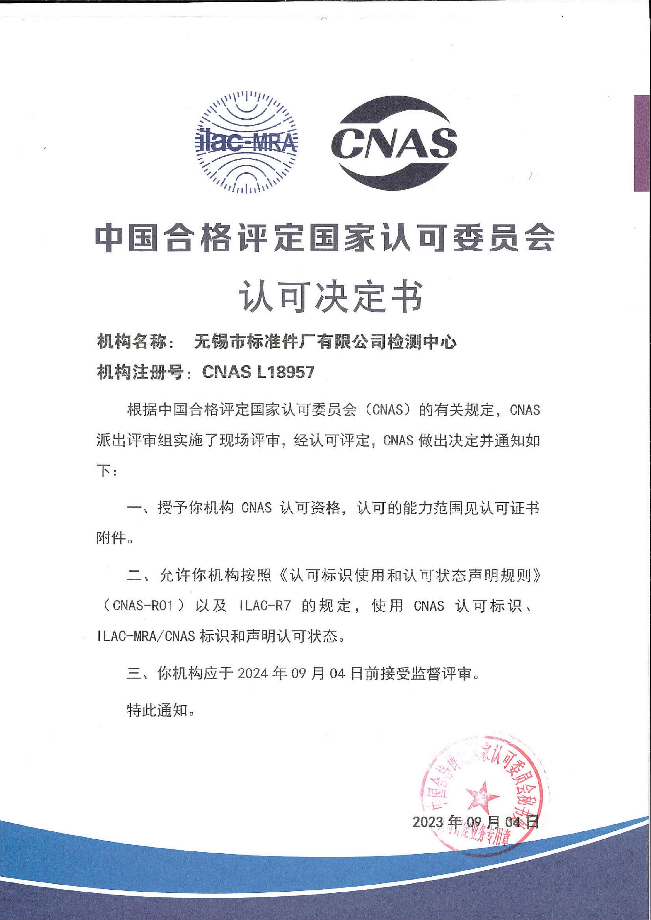 CNAS认可决定证书